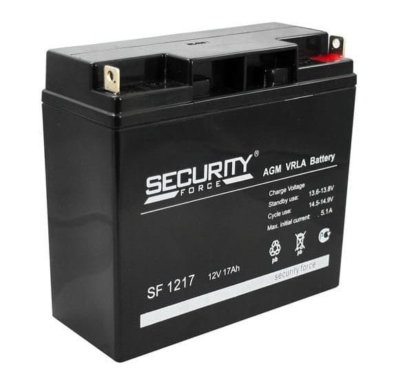 Аккумулятор Security Force SF 1217 выполнен по технологии AGM: стекловолоконный микропористый заполнитель пропитан электролитом, что устраняет угрозу утечки водного раствора серной кислоты и преждевременного отказа в условиях вибрации, снижает скорость коррозии электродов. Укомплектован предохранительным клапаном сброса газов при повышении давления выше установленного значения.