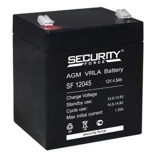 Аккумулятор Security Force SF 12045 реализован в технологии AGM: состоит из свинцовых электродов и микропористых стекловолоконных сепараторов с абсорбированным электролитом. Оборудован предохранительным клапаном для автоматического сброса давления от газов, невозвращенных в электролит. Доливать дистиллят не нужно благодаря рекомбинации газа до 99 %. Преимущества конструкции: исключение утечки кислоты и взрыва, сниженная скорость коррозии электродов, высокая стойкость при работе в условиях вибрации.