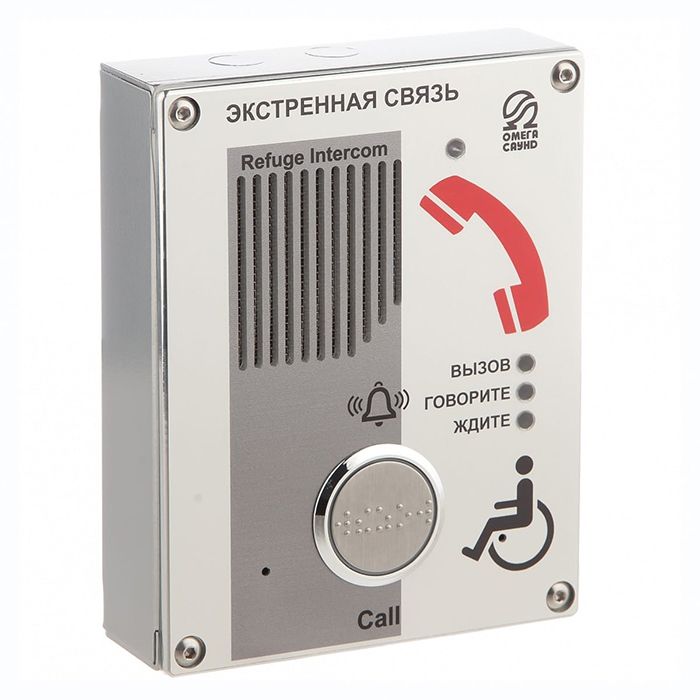 Разговор с диспетчером, в полнодуплексном режиме, происходит через встроенные в корпус абонентского устройства микрофон и громкоговоритель. Данная модель имеет прекрасный дизайн и легко вписывается в любом интерьере. На лицевой панели устройства расположены светоиндикаторы состояния устройства и кнопка вызова дежурного персонала, с нанесенной на ней надписи «Вызов» тактильным шрифтом Брайля. Цвет корпуса и лицевой панели – серебристый.