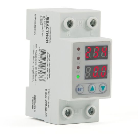 220 В, 63 А. Реле напряжения для защиты от длительного аварийного повышения напряжения в сети. Защитное отключение при авариях в сети с автоматическим восстановлением. Цифровая индикация текущего напряжения и тока, индикация аварийных ситуаций. Уровни защиты: от повышенного напряжения сети, регулируемый порог — 230...300 В; от пониженного напряжения сети, регулируемый порог — 145...210 В; защита от КЗ превышения тока, регулируемый порог — 1...63 А; регулируемая задержка включения — 3...300 сек. Стандартный корпус на DIN-рейку, ширина — 2U.