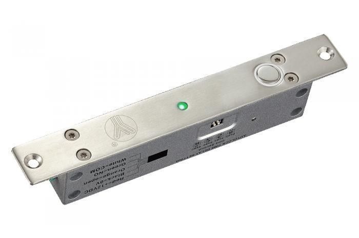 Зауженный нормально-открытый соленоидный ригельный замок под узкий дверной профиль с мониторингом положения двери и состояния замка; DC 12В; 140 мА (режим ожидания), 1100 мА (рабочий режим); планка - алюминий, ригель - сталь; размеры 200*28*39 мм (ДШВ), таймер на выбор 0; 3; 6 и 9 секунд
