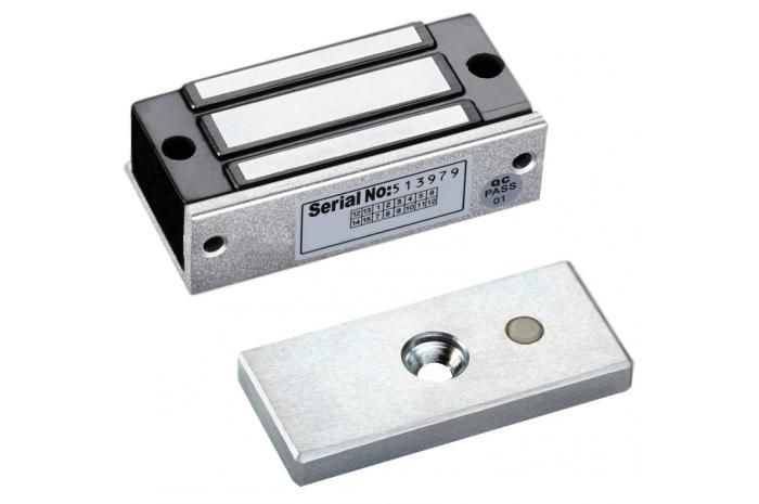Миниатюрный электромагнитный замок c силой удержания до 60 кг; DC 12 В; 260мА; габариты замка 80*39*24,5 мм; габариты ответной пластины 80*33*20 мм