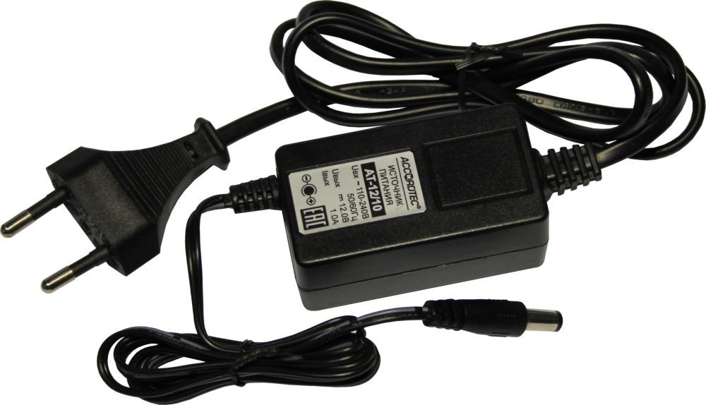 Источник вторичного питания стабилизированный, U-вх. ?110...240 В, U-вых. =12 В, I-ном. 1,0 А, I-макс. 1,5 А, защита от КЗ и перегрузки, t-раб. -10...+40 °С, габ.размеры 64x35x27 мм, пласт.корпус.