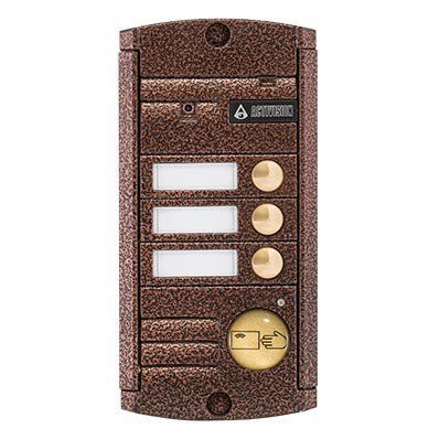 Антивандальная цветная видео панель нового образца на трех абонентов системы PAL со встроенным контроллером proximity (Proxy). Исполнение корпуса в современном дизайне для "накладной" установки из прочного алюминиевого сплава, покрытого ударопрочной порошковой краской. Обладает дополнительной влагозащитой и антикорозийностью. Вызывная панель данной модели сохраняет работоспособность при критических перепадах температуры среды ее применения. Кнопки вызова способны выдерживать фронтальные удары благодаря особенностям внутренней конструкции. Так же в ней реализована инновационная система интеллектуальной подсветки лица гостя, регулирующаяся в зависимости от дальности его расположения. Цветовая гамма состоит из двух цветов: серебряный антик и медный антик.