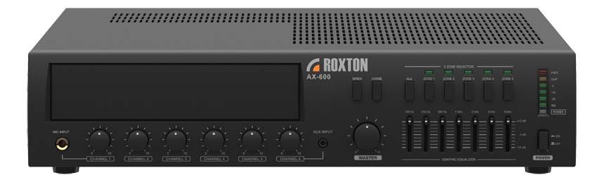 Встроенный селектор зон, коммутирующий высоковольтные выходы усилителя с пятью линиями громкоговорителей даёт возможность выбора, в какие зоны транслировать аудиосигнал. Помимо этого, ROXTON AX-600 оборудован 7-ми полосным графический эквалайзером выходного аудиосигнала позволяющего получать требуемую выразительность и громкость звучания транслируемой музыки и речи. Применение усилителя класса D и импульсный блок питания позволили добиться снижения веса усилителя и уменьшения потребляемой энергии без потери качества транслируемого звука. Сочетание огромного количества функций, простоты использования и надёжности сделали ROXTON AX-600 незаменимым при озвучивании кафе, баров, ресторанов, административных и офисных помещений.