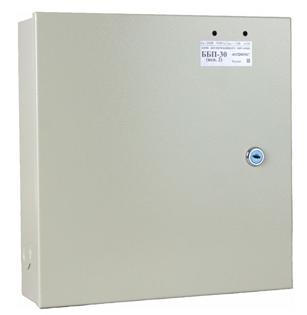 Блок бесперебойного питания ББП-30 (исп.2) предназначен для бесперебойного питания устройств и приборов охранно-пожарной сигнализации, систем видеонаблюдения и связи, систем контроля доступа напряжением 12В постоянного тока. Источник питания обеспечивает автоматический переход на питание от аккумуляторной батареи при пропадании сетевого напряжения и обратно. Задержка при переключении на аккумуляторную батарею отсутствует. Ключевыми особенностями ББП-30 (исп.2) являются: расширенный диапазон входного напряжения от 110V до 250V AC; регулировка выходного напряжения от 11.7В до 14.7В; номинальный ток нагрузки 3.0 А, максимальный 4.9 А; наличие электронной защиты от короткого замыкания и светововой индикации режимов работы, а также защиты от глубокого разряда аккумулятора. Блок бесперебойного питания Accordtec ББП-30 (исп.2) поставляется в корпусе, рассчитанном на размещение батареи 17 А/ч, и предназначен для эксплуатации в закрытых помещениях.