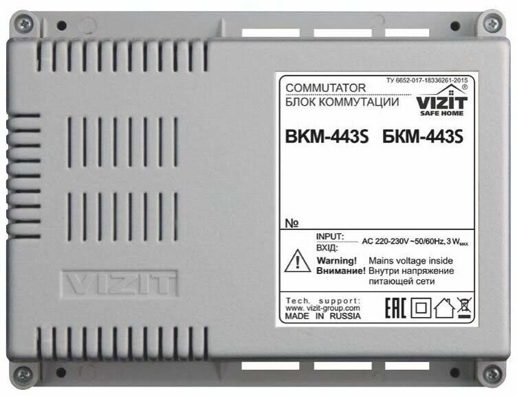 БКМ-443. Блок коммутации и питания монитора. Возможность подключения 3-х мониторов VIZIT-M428C, -М442M, -М457М, -М468М, -М71М и УКП. Подключение 3-х БВД, кнопки "Звонок" и дополнительной телекамеры или БВД-403СРО. Функция "интерком" при использовании мониторов VIZIT-М442M, -М468М. Напряжение питания 187-242VAC. Рекомендуется устанавливать в монтажные боксы VIZIT.