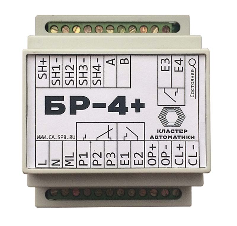 «БР-4+» принимает сигналы от приборов пожарных управления (ППУ), управляет приводом пожарного клапана, контролирует его положение и исправность цепей положения и управления, передает ППУ сигналы о положении клапана, неисправности блока и цепей управления и положения. Прибор имеет шлейфы подключения ЭДУ для реализации режима ручного управления. «БР-4+» имеет гальваническую развязку сигнальных цепей и цепей управления. Прибор питается от цепи питания привода (220В переменного тока).