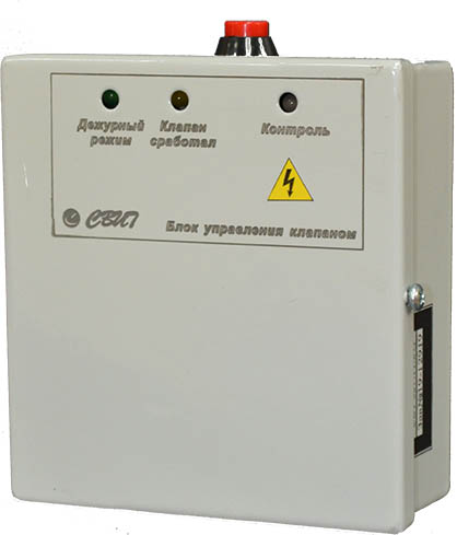 Блок управления огнезадерживающим клапаном с возвратной пружиной. В дежурном положении клапан находится под напряжением. При поступлении команды "Пожар", БУОК-1 снимает с привода электропитание и заслонка клапана занимает защитное положение под воздействием возвратной пружины. На блоке имеются кнопка ручного пуска (опробирования) клапана и индикаторы начального и конечного положений, а также индикатор "Контроль".
