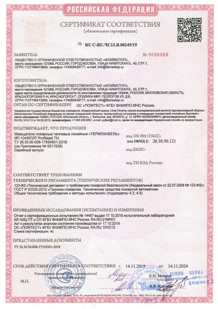 Термокабель (чувствительный элемент), t-сраб.68°С, оболочка нейлон, D-внеш.4,5 мм, вес 20 кг /км. Поставляется совместно с МИП2И "ТЕРМОКАБЕЛЬ".
