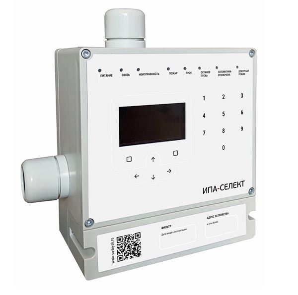 Извещатель пожарный аспирационный ИПА-СЕЛЕКТ предназначен для защиты объектов от пожаров и управления автоматическими средствами пожаротушения. Рекомендуется для защиты помещений небольшой площади, серверных, холодных складов с температурой до минус 30 °C, объектов, где возможно кратковременное присутствие факторов, идентичных дыму (пар, мелкодисперсная пыль, сценический дым). Принцип работы основан на активном отборе воздуха через систему труб с отверстиями, расположенную защищаемой зоне, анализа концентрации угарного газа, температуры, концентрации дыма и формирование извещений во внешние цепи сигналов «Дежурный режим», «Пожар 1», «Пожар 2», «Пуск», «Останов пуска», «Неисправность».