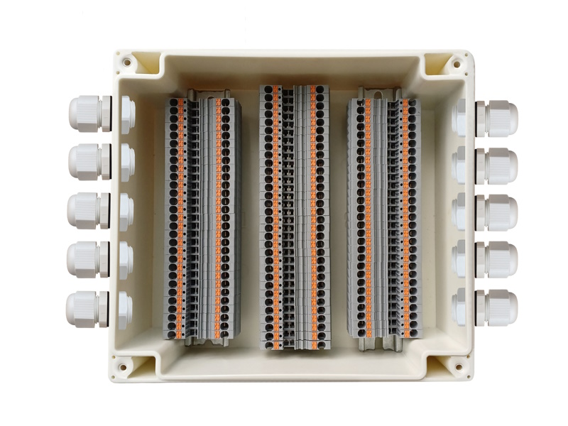 Коробка конструктивно состоит из основания, внутри которого расположены проходные клеммники. Основание коробки закрывается герметичной крышкой и фиксируется винтами. Корпус коробки оборудован герметичными кабельными вводами* для подведения проводников диаметром от 6 до 12 мм* (*- по согласованию с заказчиком коробка может поставляться в «глухом» исполнении или с 1-12 шт пластиковыми или металлическими кабельными вводами М6-М50 с диаметром подключаемого кабеля от 3 до 48 мм, а также для подсоединения бронекабеля, трубной проводки и металлорукава).
