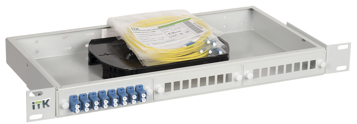 Оптический кросс 19", 1U, укомплектованный на 12 адаптеров LC Duplex, SM 9/125 OS2, стальной, серый, в комплекте: адаптеры, монтажные шнуры 1.5м, сплайс-кассета с крышкой, гильзы, заглушки.