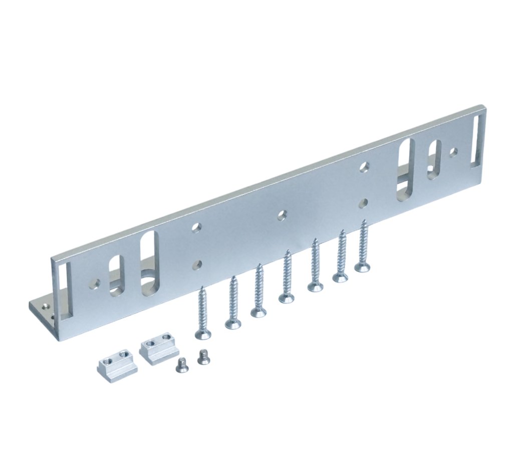 Уголок для крепления замков серий ML-295A**/ML-350A** с плавной регулировкой положения замка относительно уголка (за счёт наличия технологического паза). Цвет серебро, материал алюминий. В комплекте саморезы и Т-образные гайки. Габаритные размеры: 250х47х31 мм.