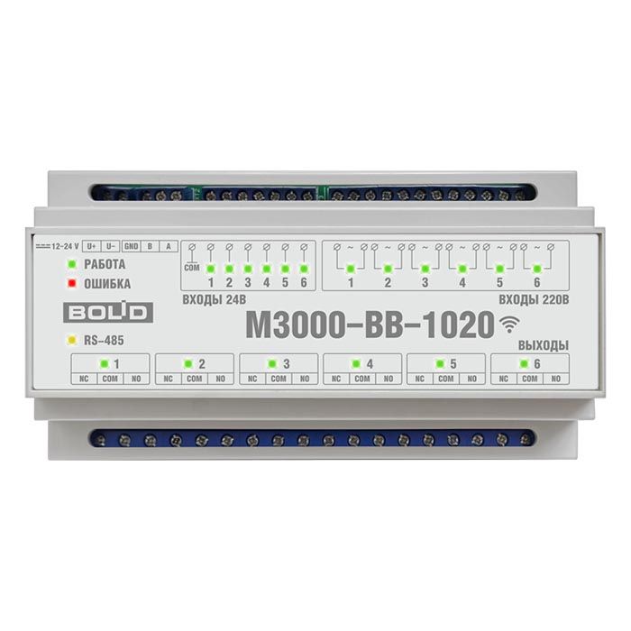 М3000-ВВ-0020 Модуль ввода-вывода. 6 дискретных входов и 6 выходов, коммутируемый ток - до 10 А. Питание 12-24 В. Поддержка проводного RS-485 (Modbus) и беспроводного WiFi