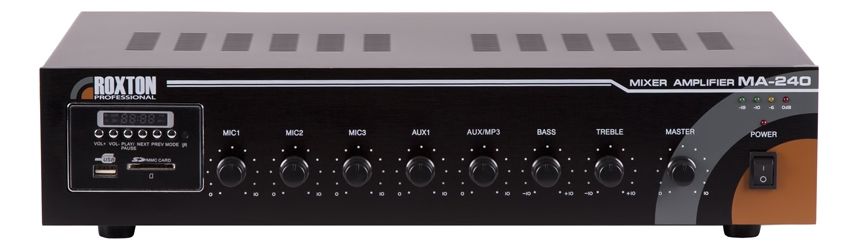 Для организации фонового озвучивания можно использовать радио тюнер или USB носитель с записанным музыкальным или рекламным материалом. Дополнительное удобство использования ROXTON MA-240 дает входящий в комплект поставки пульт дистанционного управления медиа- проигрывателем и уровнем сигнала. К усилителю можно подключить до трёх микрофонов и до двух источников сигнала с линейным уровнем (например, цифровой магнитофон, звуковая карта ПК, CD проигрыватель и т.д.). Для подключения устройства записи или дополнительного усилителя к MA-240 предусмотрен линейный выход.