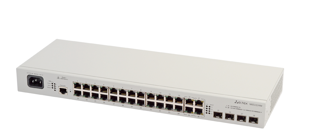 24 порта 10/100Base-T, 4 комбо-порта 10/100/1000Base-T/1000Base-X, встроенная грозозащита на портах. Управляемый коммутатор MES1124M является обновленной версией MES1124. Особенность коммутатора: защита от скачков напряжения до 6 кВ (в соответствии со стандартом IEC61000-4-5).