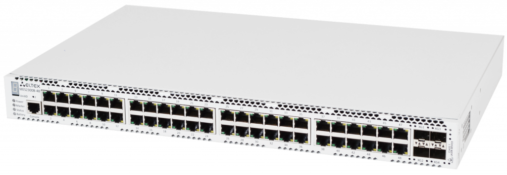 MES2300B-48 AC имеет 48 гигабитных Ethernet-портов и четыре порта SFP+ по 10 Гбит/c. Помимо питания от сети 220 В, есть возможность питания от внешнего аккумулятора 12 В с автоматическим переключением на него в случае отказа основного источника.