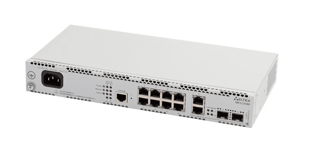 MES2308R - это 10-ти портовый гигабитный L3 коммутатор с поддержкой стекирования. Компактный вариант коммутатора доступа с широким доступным функционалом, отличительной особенностью данной модели является наличие 2 комбо портов. Для подключения доступно 8х10/100/1000BASE-T (RJ-45) и 2х10/100/1000BASE-T/1000BASE- X/100BASE-FX Combo