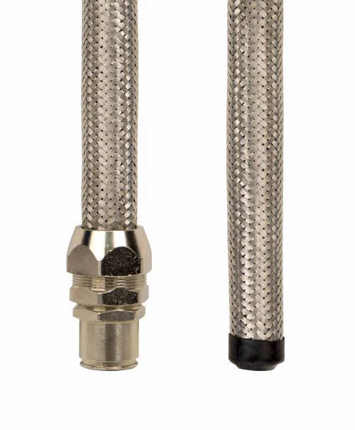 Гибкие металлические трубы могут прокладываться под удобным углом, что повышает адаптивность системы под различные задачи и облегчает монтаж. Отличительные особенности металлорукавов - гибкость и высокая прочность. Металлорукав в EVA-изоляции с оплеткой из нержавеющей стали используется для прокладки электрических, телефонных, телевизионных проводов. Он отличается значительной температурной, механической, коррозионной устойчивостью. Оболочка выполнена из самозатухающего материала, не содержащего галогенов и почти не выделяющего дым при горении. Внутренний диаметр - 10 мм.