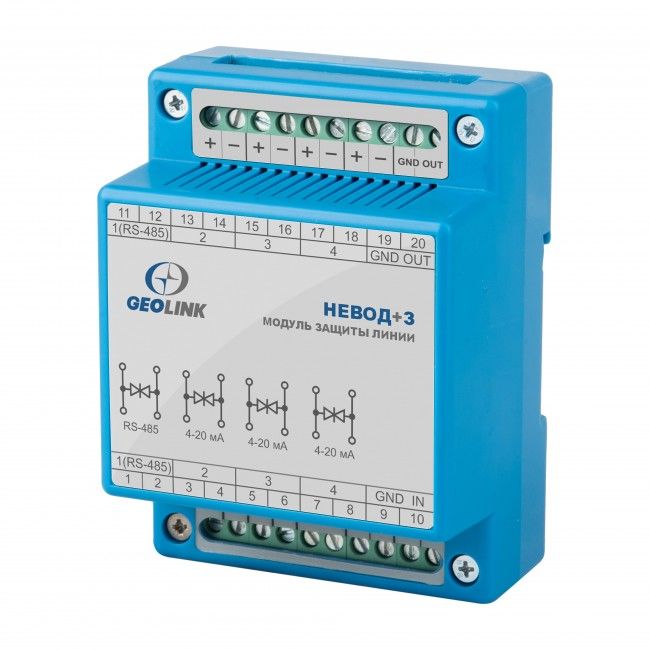 Модуль защиты Невод+З предназначен для защиты длинных кабельных линий связи и оборудования систем автоматизации, подключенного к нему, от бросков напряжения и сверхтоков. Рекомендуется использовать при длинных линиях связи, проложенных вне помещений или рядом с каналами силовых кабелей. Модуль не предназначен для защиты антенно-фидерных устройств. Наличие модуля защиты позволяет значительно снизить частоту выходов из строя как цифрового измерительного оборудования, так и датчиков из-за грозовых разрядов, наводок и бросков напряжения в сети. Модуль защиты Невод+З может использоваться как в составе шкафов автоматики, построенных на базе модулей линейки Невод, так и совместно с другим оборудованием. Устройство имеет 4 защищаемых канала: 3 канала предназначены для защиты сигнальных линий датчиков (интерфейсы 4-20 мА, 0-20 мА, 0-5 мА, 0-30 В) и 1 канал предназначен для защиты линий цифрового проводного интерфейса RS-485. Устройство конструктивно выполнено в виде печатной платы с радиоэлементами, установленной в пластмассовый корпус, и предназначено для монтирования в шкаф. Прибор имеет защелку для крепления к стандартной DIN-рейке. На крышке размещены шильдик с названием и параметрами прибора. Крышка имеет окна для подключения входных и выходных цепей прибора через винтовые клеммные соединители, установленные на печатной плате.