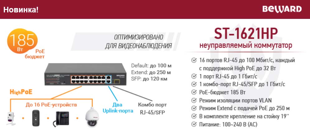 PoE коммутатор ST-1621HP предназначен для тех, кто не хочет переплачивать за излишний PoE бюджет. PoE бюджет коммутатора ST-1621HP составляет 185 Ватт. Этого достаточно для подключения большинства современных внутренних и уличных компактных камер видеонаблюдения с ИК-подсветкой. Кроме того, все порты поддерживают технологию High PoE в соответствии со спецификацией стандарта IEEE 802.3af/at с максимальной мощностью до 32 Ватт на порт.