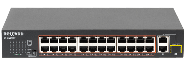 PoE коммутатор ST-2421HP предназначен для тех, кто не хочет переплачивать за излишний PoE бюджет. PoE бюджет коммутатора ST-2421HP составляет 185 Ватт.