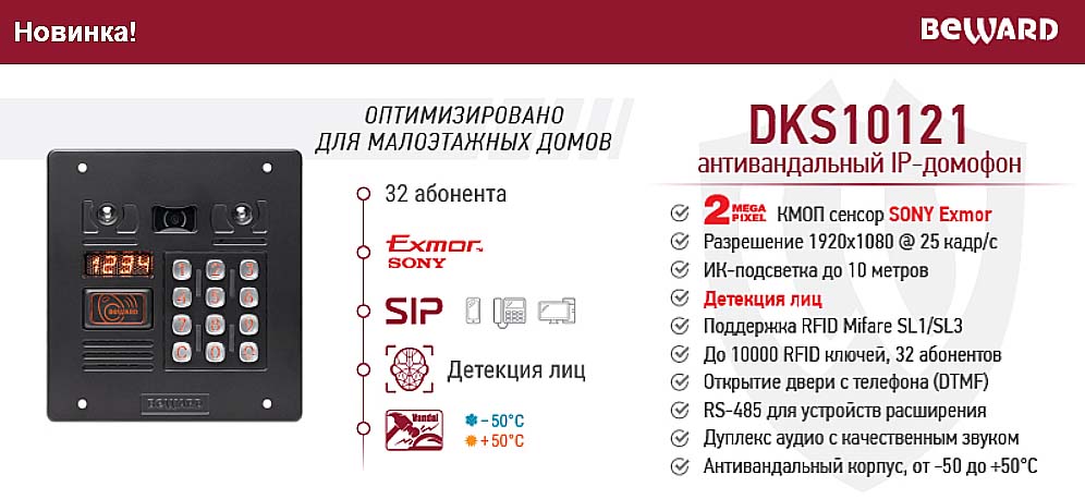 Новинка! Многоабонентский IP домофон Beward DKS10121 предназначен для организации контроля доступа в подъезд многоквартирного дома. Для передачи качественного видео в IP домофоне применяется камера разрешением 2 Мпикс. Аудио в дуплекс формате и видео передается с использованием протокола SIP.