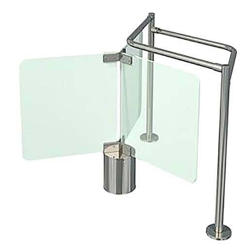 Турникет Толстый РОТРИК, серия МОДЕРН. Стойка РОТОРа с ОГРАЖДЕНИЕМ зоны вращения, ТРИ створки из ЗАКАЛЕННОГО стекла, ДВА выносных индикатора направления прохода.