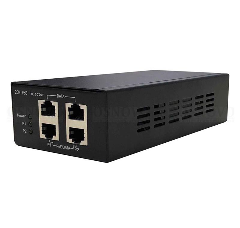 РоЕ-инжектор Osnovo Midspan-2/602G предназначен для передачи питания по витой паре от сетевого коммутатора или видеорегистратора к двум потребителям — IP-камерам, вызывным панелям домофонов etc — и данных от IP-устройств в противоположном направлении. Общий бюджет РоЕ — 60 Вт, на один порт — 30 Вт.