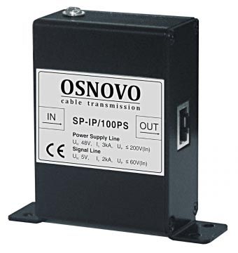 Устройство Osnovo SP-IP/100PS для линий Fast Ethernet с поддержкой PoE (метод Б, IEE802.3af/at) предназначено для защиты слаботочного оборудования систем IP-видеонаблюдения и LAN от перенапряжений и индуцированных токов, в том числе вызванных атмосферными искровыми разрядами. Форма импульса разрядного тока — 8/20 мкс, сила разрядного тока для линия-линия — 2.5 кА/3 кА, линия-земля — 2.5 кА. Время отклика для линии данных: ≤1 нс, для линии PoE — ≤25 нс. Рабочее номинальное напряжение — 5/48 В, максимальное — 6/60 В.