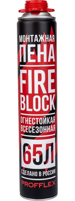 Противопожарная пена PROFFLEX FIRE BLOCK 00225 - всесезонная и высокопроизводительная противопожарная монтажная пена с повышенным выходом. Применяется для монтажа оконных и дверных блоков, заделки и теплоизоляции сетей водопровода, канализации и центрального отопления, соединения и герметизации готовых сборных элементов в деревянном домостроении.