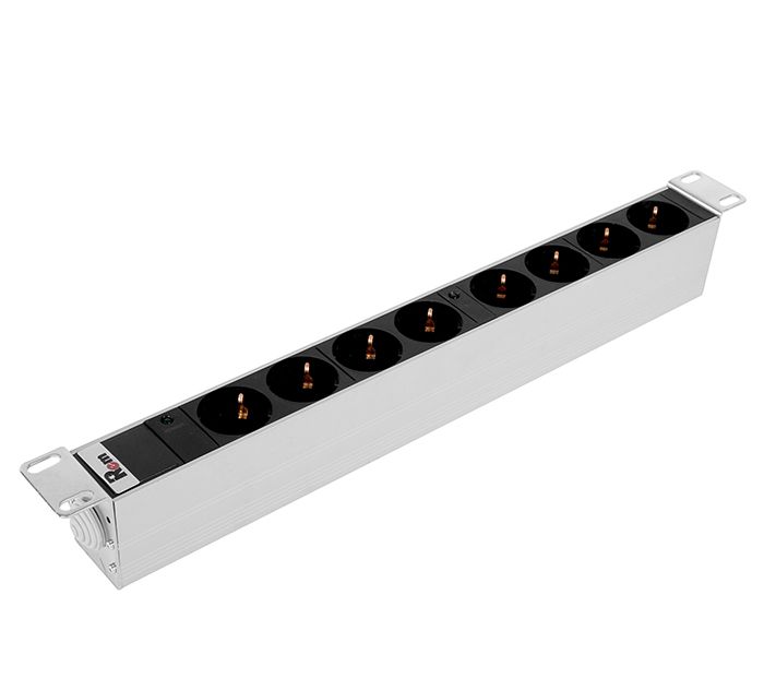 Блок силовых розеток имеет восемь портов стандарта Schuko, выполнен в анодированном алюминиевом корпусе. Розетки расположены горизонтально, для удобного подсоединения коленчатых штекеров. На лицевой части блока установлен индикатор. Вход кабеля питания - клемная колодка. Кабель питания в комплект поставки не входит. Совместим со всеми линейками 19” монтажного оборудования. Поставляется в индивидуальной упаковке с комплектом крепежа. Выполнен в системе несущих конструкций 482,6 мм по ГОСТ 28601.2 (19-дюймовые конструктивы по МЭК 297).