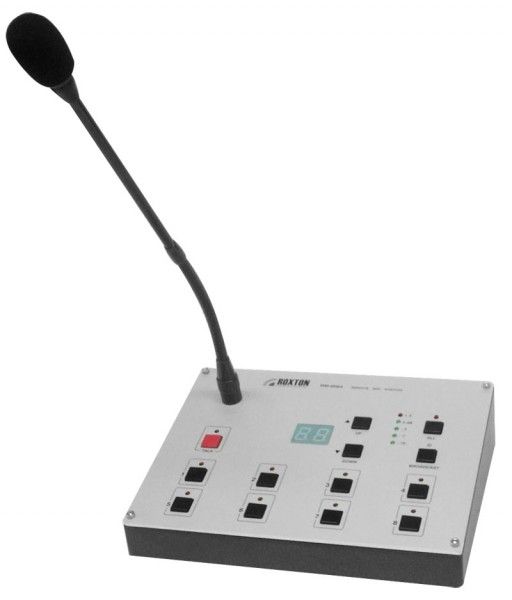 Микрофонная консоль ROXTON RM-8064 совмещает в себе функции селектора зон и микрофона. Предназначена для дистанционного управления 64-мя комбинированными системами ROXTON RA-8236. Благодаря встроенному в консоль селектору зон возможно выборочно передавать речевые сообщения с микрофона в одну или несколько зон оповещения. Помимо этого консоль оборудована линейным входом для подключения внешних источников аудиосигнала.