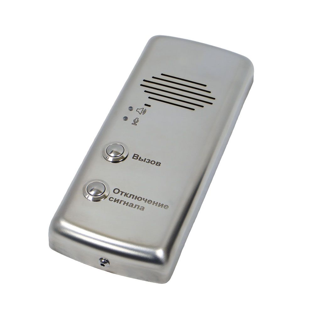 Накладное вандалозащищенное переговорное устройство со встроенной кнопкой отключения оповещателя устанавливается в зонах безопасности инвалидов, лифтовых холлах и других технологических помещениях. Обеспечивает передачу сигнала "Вызов" на диспетчерский пункт, двухстороннюю переговорную связь между диспетчерским пунктом и местом установки переговорного устройства, индикацию режима работы - прием/передача, отключение свето-звукового оповещателя. Связь полудуплексная, управление разговором осуществляет диспетчер.