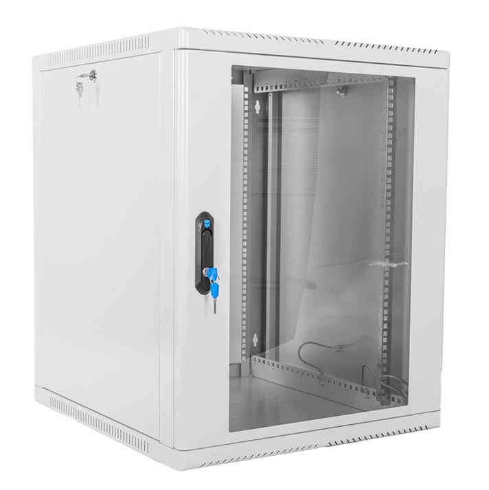 Настенный шкаф 19" ШРН имеет цельнометаллическую сварную конструкцию, он удобен для быстрой установки и монтажа оборудования, так как не требует сборки. Отсутствие острых углов с фронтальной стороны повышают безопасность при эксплуатации и обслуживании шкафов, что помогает исключить человеческие травмы при соприкосновении со шкафом. Комплектация дверью с тонированным ударопрочным стеклом. Новая конструкция стеклянной двери с механическим креплением стекла увеличивает её жесткость, и обеспечивает легкую замену стекла при его повреждении. Возможна установка двери, как с правой, так и с левой стороны. Новый усиленный точечный замок с поворотной ручкой увеличивает жесткость фиксации двери в закрытом положении и защиту от несанкционированного доступа, а также обеспечивает удобство при её открывании.