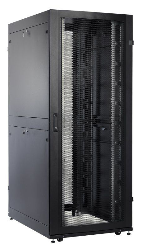 Шкаф монтажный телекоммуникационный 19" ПРОФ напольный, разборный, 42U, полезная глубина 690 мм, распределенная нагрузка 1350 кг, передняя и задняя дверь перфорация, площадь перфорации двери 65%, ручка с замком, цвет черный (RAL 9005), 1950х800х930 мм.