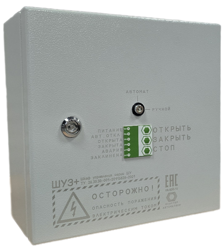 Шкафы управления серии ШУ типа “ШУЗ+”, в зависимости от модификации, предназначены для автоматического управления электроприводами задвижек (ЭЗ) автоматических установок пожаротушения (АУПТ) и систем внутреннего противопожарного водопровода (ВППВ), входящих в состав системы противопожарной защиты объекта, по командам внешнего ППКПУ. В шкафу предусмотрена защита от перегрузок и токов коротких замыканий, контроль целостности цепей управления электродвигателем, а также автоматическое управление электродвигателем, с выдачей сигналов о состоянии шкафа в систему пожарной автоматики.