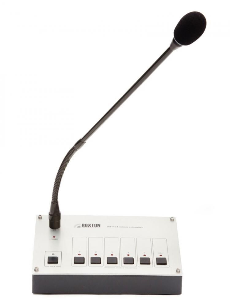 Микрофонная консоль ROXTON SX-R31 работает совместно с комбинированными системами ROXTON SX-240, ROXTON SX-480 и ROXTON SX-480N. Микрофонная консоль - это устройство, совмещающее в себе функции селектора зон, микшера и микрофона. Консоль ROXTON SX-R31 предназначена для выбора нужных зон (до 5 зон) и передачу в них речевого сообщения с микрофона или музыкального источника, подключенного к разъему на задней панели. Консоль осуществляет дистанционное управление комбинированной системой ROXTON SX-240/480, в заданном приоритете (1~4 приоритеты). Приоритеты означают, что консоль с высшим приоритетом, прерывает (блокирует) работу консоли с низшим (меньшим) приоритетом. Приоритет консоли соответствует ее адресу. Питание консоли осуществляется от комбинированной системы по информационному кабелю. Конструктивно блок выполнен в металлическом корпусе в настольном исполнении.