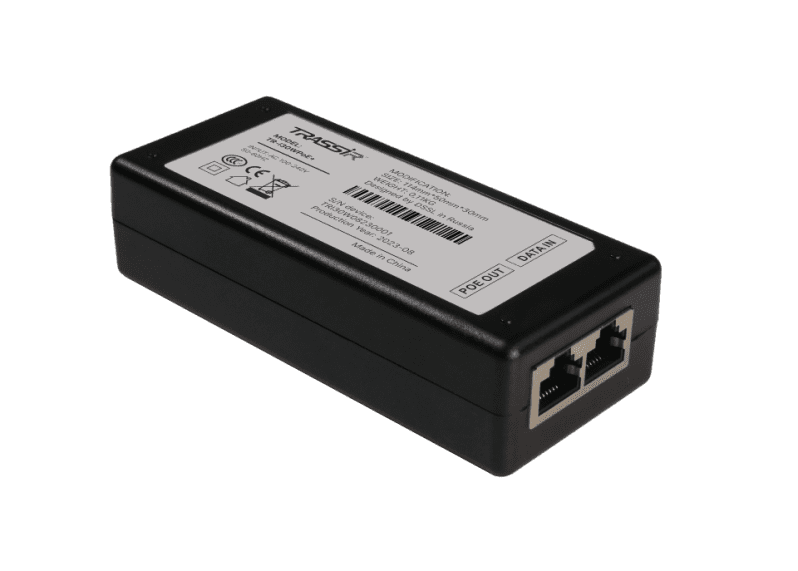 PoE-инжектор TRASSIR TR-I30WPoE+ оборудован сетевым RJ-45 и PoE-портом RJ-45. Питание — AC 100 ~ 240 В. Размер — 114х50х30 мм. Вес — 110 г. Рабочая температура — –10 °С… +65 °С.