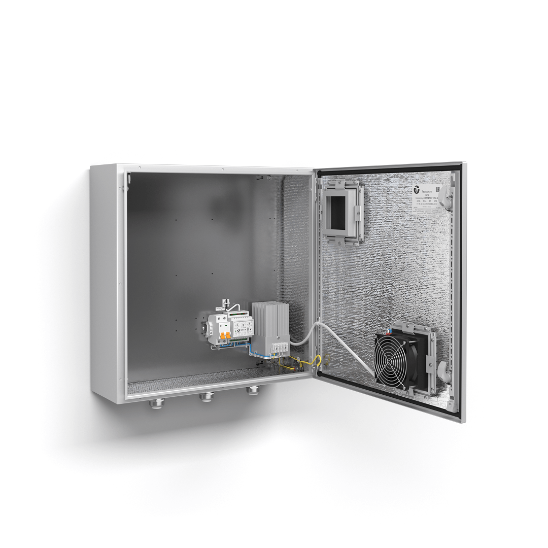 Термошкаф с обогревом и вентиляцией для установки в нем телевизионного, либо другого электронного оборудования. Диапазон рабочих температур -50° x +50°C. Степень защиты IP55. Потребляемая мощность 236 Вт. Напряжение питания 230V ± 10% AC, 6A. Максимальная мощность тепловых потерь устанавливаемой в шкаф аппаратуры 200 Вт. Габаритные размеры (без гермовводов) 600x760x350мм.