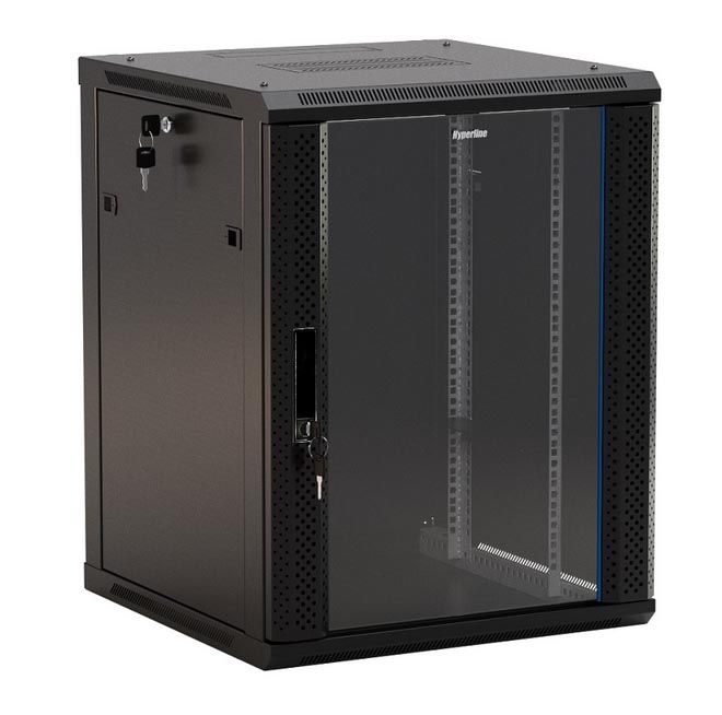 TWB-1245-GP-RAL9004 HYPERLINE Шкаф настенный 19-дюймовый (19"), 12U, 650x600х450мм, стеклянная дверь с перфорацией по бокам, ручка с замком, цвет черный (RAL 9004) (разобранный)
