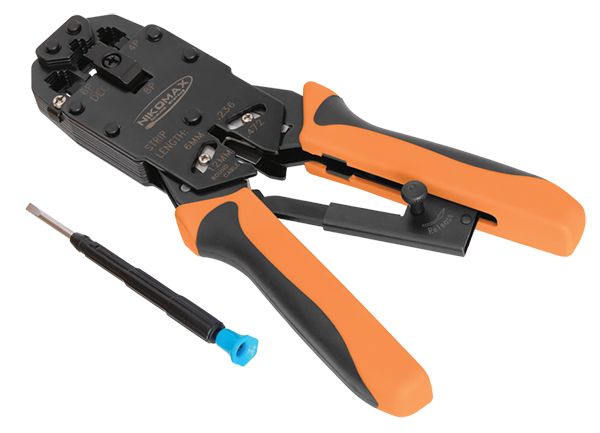 Обжимные инструменты (кримперы) предназначены для обжима коннекторов типа Registered Jack (RJ) на телефонных кабелях и кабелях передачи данных. Кримпер NMC-2008AR предназначен для обжима разъемов типа RJ45/8P8C, RJ12/6P6C, RJ11/6P4C, 4P4C и 4P2C. Инструмент оборудован устройством для зачистки и обрезки кабеля. Данный инструмент является профессиональным, благодаря “торцевому” обжиму и многофункциональности.