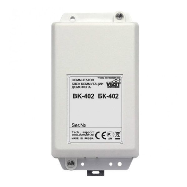 БК-402. Блок коммутации домофона обеспечивает переключение линий связи и видеосигнала. Предназначен для совместной работы с БУД-420Р, -485Р, установленных на входе в огороженную придомовую территорию, если огороженная территория имеет два или более входа, и видеодомофонами VIZIT (до 16 шт.), установленными на подъездах/ домах внутри огороженной территории.