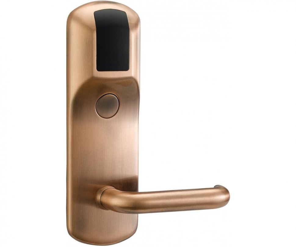 Врезной замок со встроенным контроллером (1364 польз.) и считывателем карт EM-Marine и HID (дальность 2-4 см), питание 4х1,5 В батарея АА (25 тыс. открываний), режимы "Офис", "Отель". Звуковая/световая индикация работы, подключение внешней кнопки открывания двери, цвет бронза.